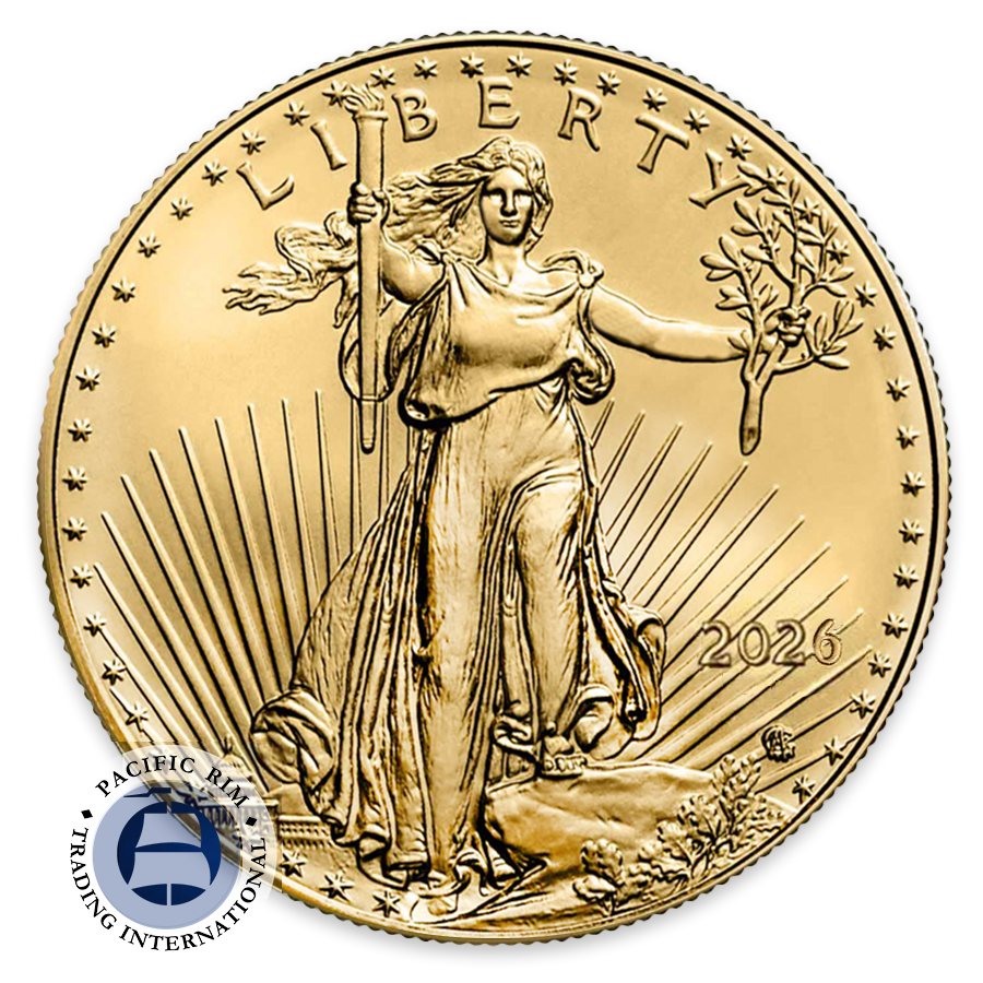First released by the United States mint in 1986, the gold American Eagle was the first modern bullion coin to be authorized by the United States congress and is backed by the US Mint for its weight, content and purity. The obverse of the coin, originally designed by Augustus Saint-Gaudens for the country's $20 gold piece minted from 1907 to 1933, carries the image of a full length figure of Lady Liberty holding a torch in her right hand and an olive branch in her left. The reverse side of the coin bears the image of a male bald eagle carrying an olive branch, flying towards his mate in a nest with their hatchlings.